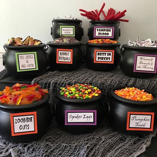 4) On crée un bar à bonbons... S'il y a un moment dans l'année ou le bar à bonbons est thématique c'est bien l'Halloween. Alors on se laisse aller et gagez que vos collègues vous seront reconnaissants pour longtemps. Toutefois, en ce temps de Covid et de grippes, n'oubliez pas de mettre de petites cuillères/pelles qui permettront de se ravitailler en bonbons sans avoir à plonger sa main à même le bol.